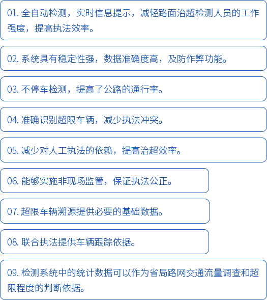 主要用于非現場執法的治超系統將不停車動態稱重、視頻監控、圖像抓拍及車牌識別、信息提示系統等有機集成,建立起一個全天候貨運車輛超載違法行為監控系統,對貨運車輛超載行為實施有效檢測和監控,為交通管理部門提供治超執法依據。在車輛行駛狀態中的超限超載檢測,有利于提高交通效率。系統的檢測數據資源可為公路行業交通量調查、路網監測等管理工作提供共享信息。